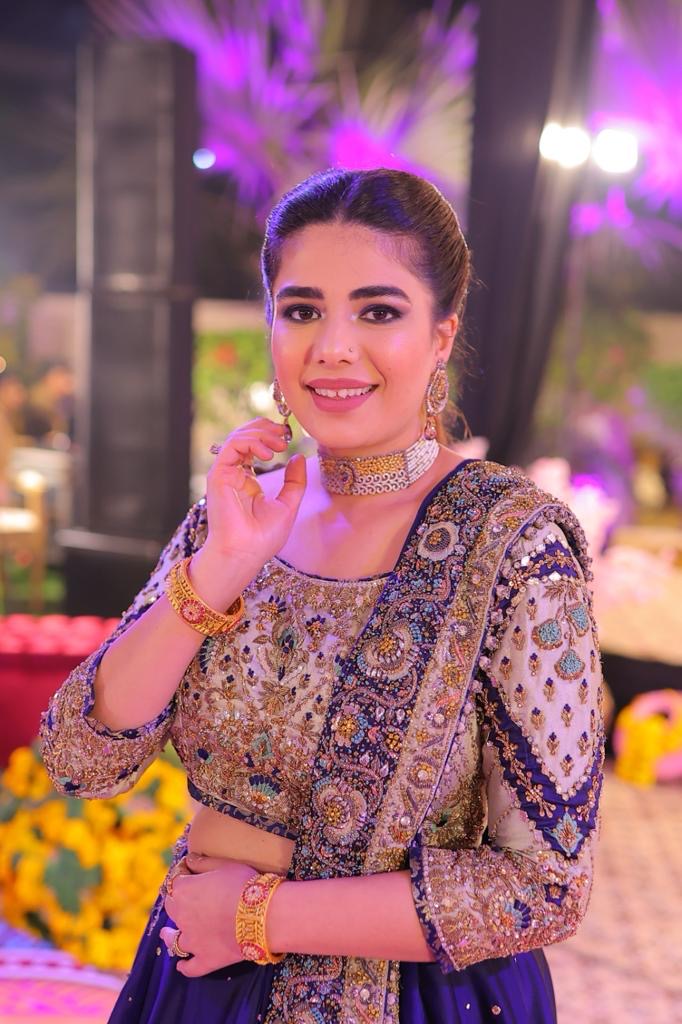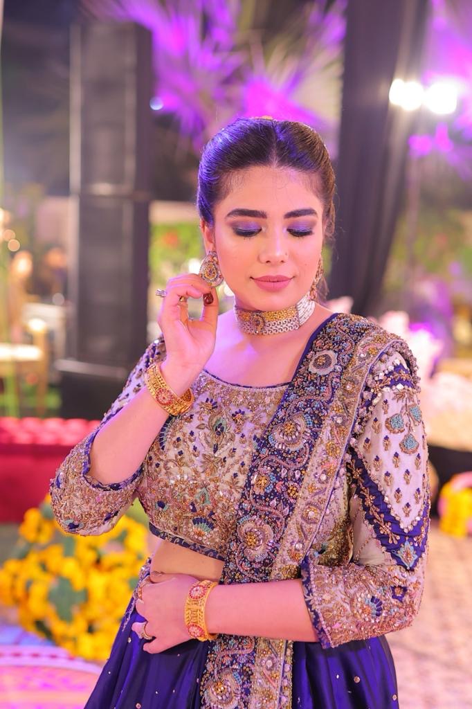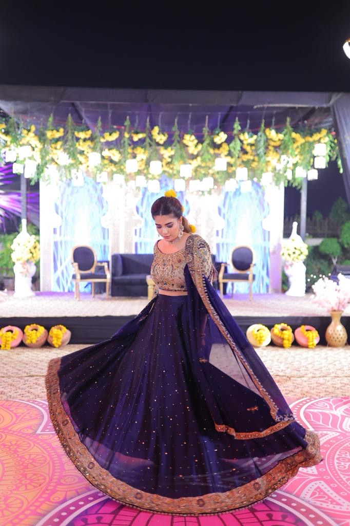 Celebrate your Mehndi in this stunning sapphire and mint green bridal ensemble. The hand-embellished choli features kora, dabka, sequin, zardozi, and Swarovski crystals, paired with a flowy lehenga with an intricately worked border. The dupatta is a showstopper, with heavy, detailed embellishments along all four sides