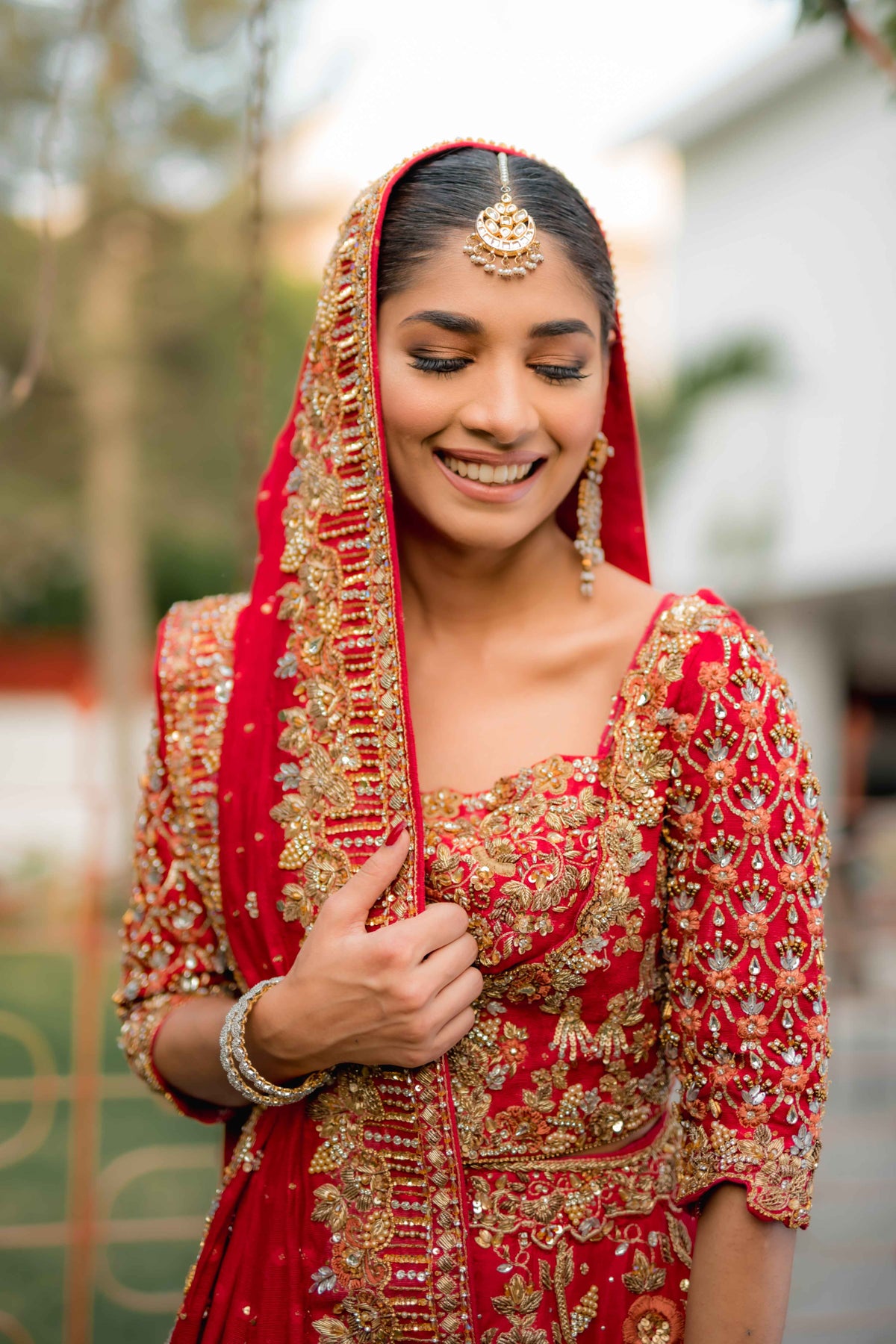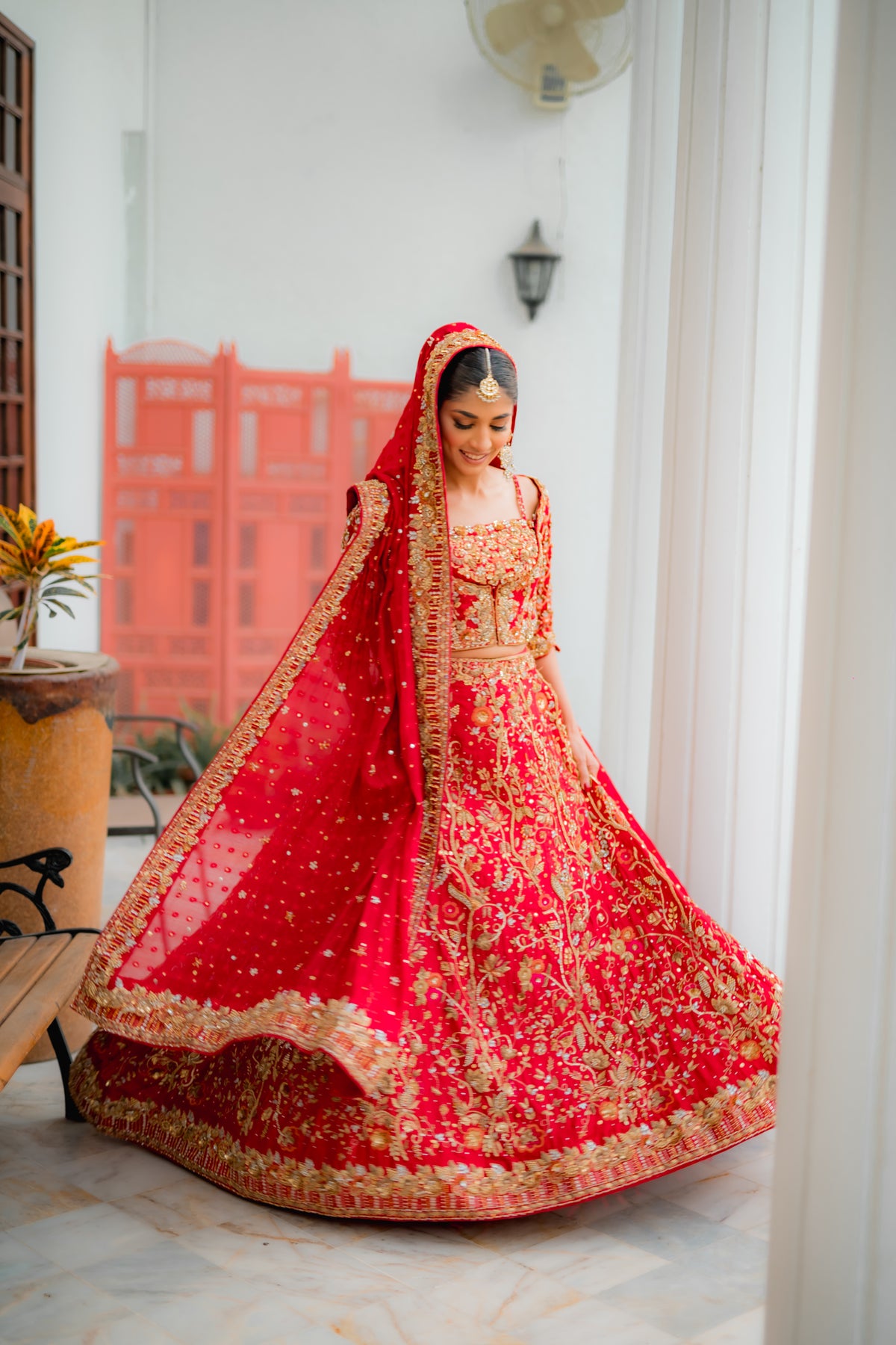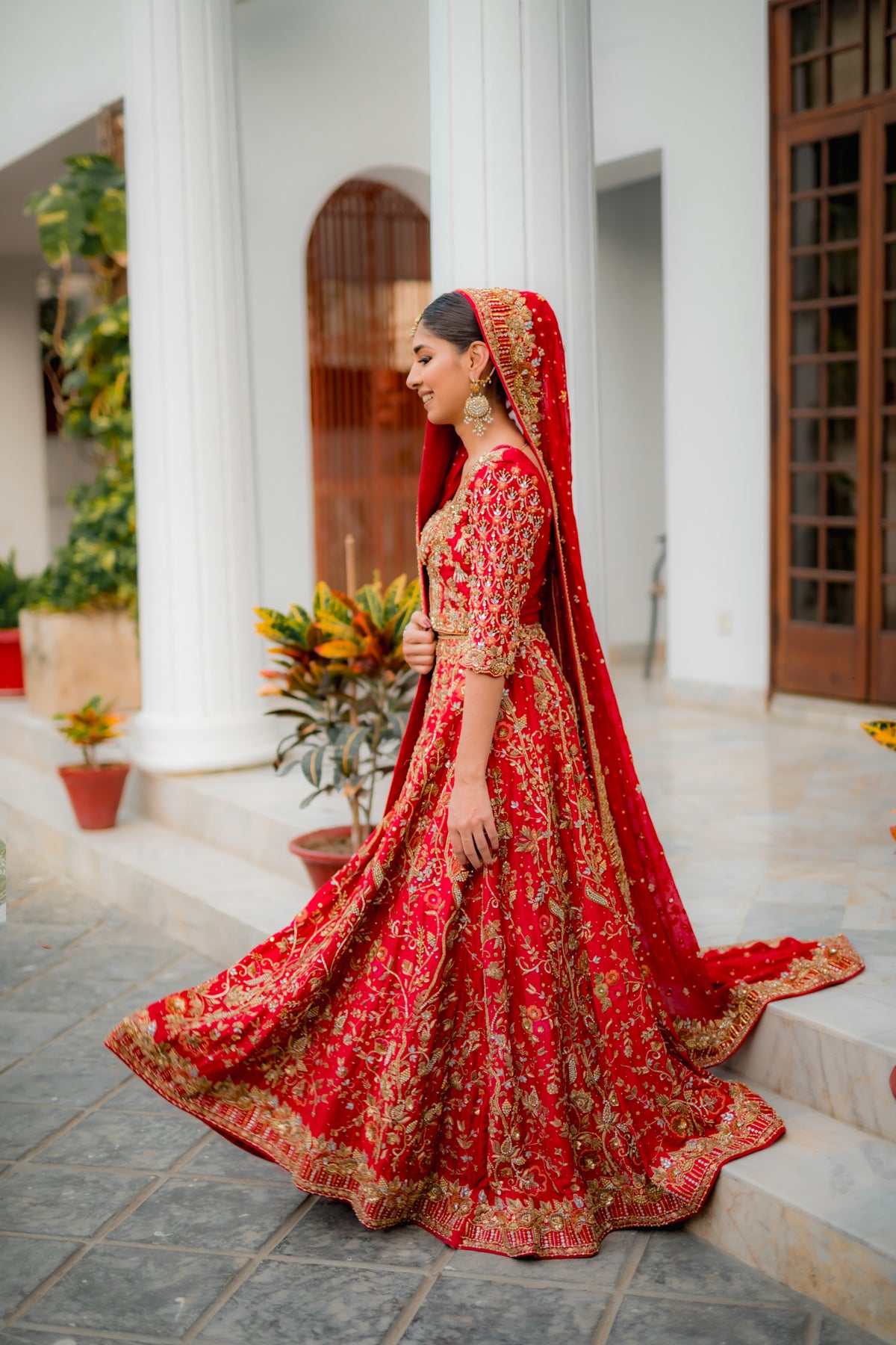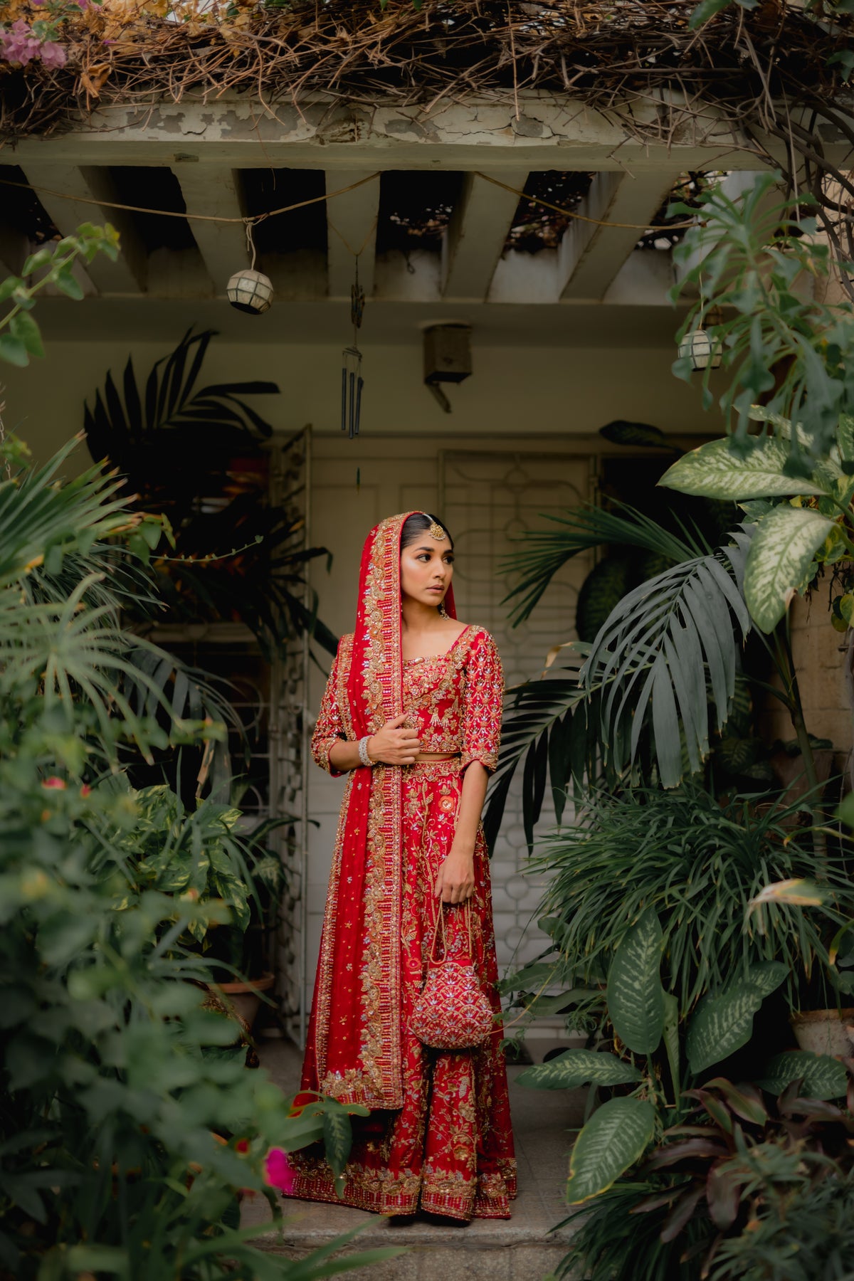 Crafted in luxurious, premium fabrics, this bridal ensemble is a masterpiece of handcraftsmanship. The outfit features exquisite hand embellishments in kora, dabka, zardozi, pearls, Swarovski crystals, and resham, meticulously applied to create a lustrous, ethereal finish. Designed with precision and attention to detail, this breathtaking couture piece combines timeless elegance with contemporary sophistication—perfect for a bride who wants to make every moment unforgettable.