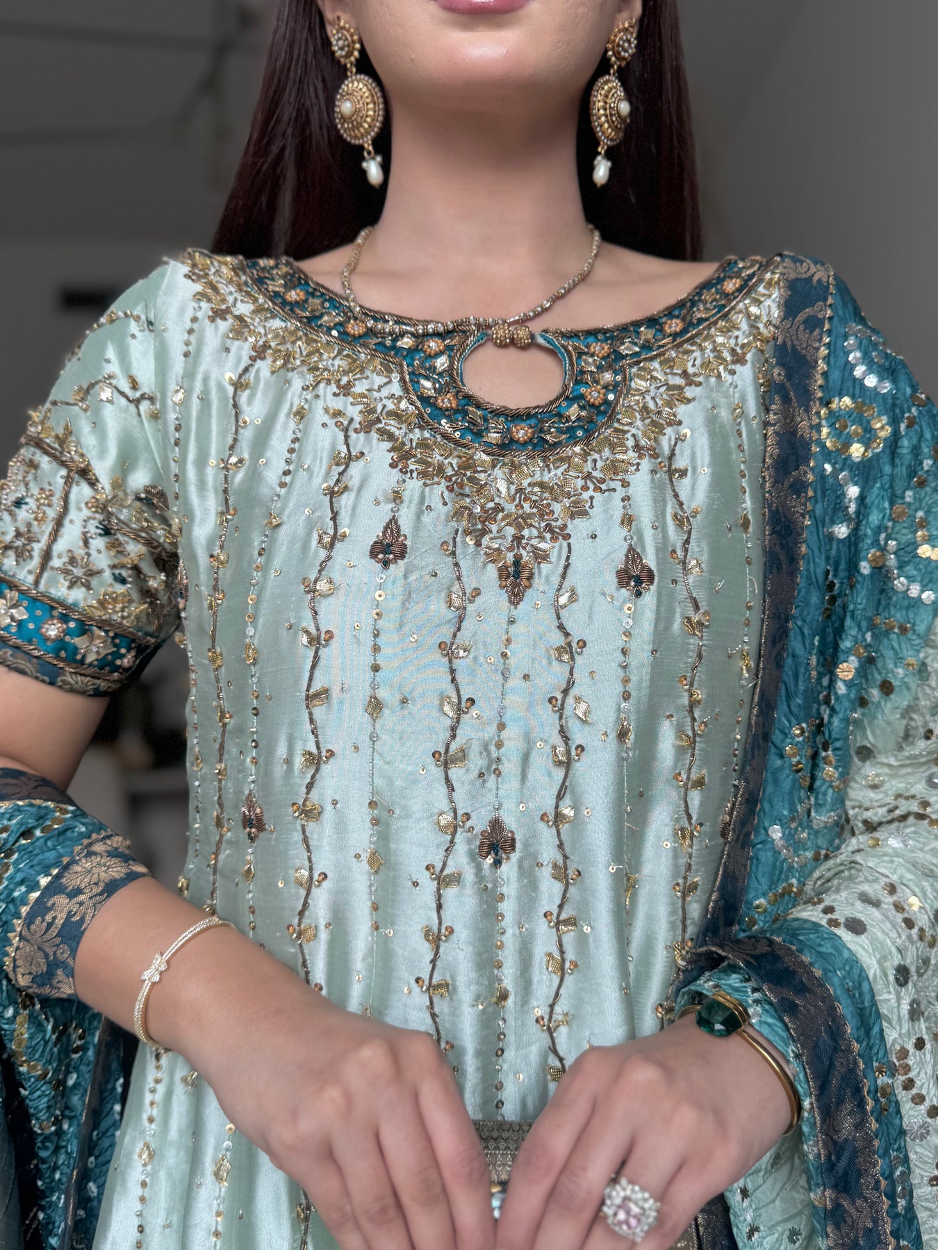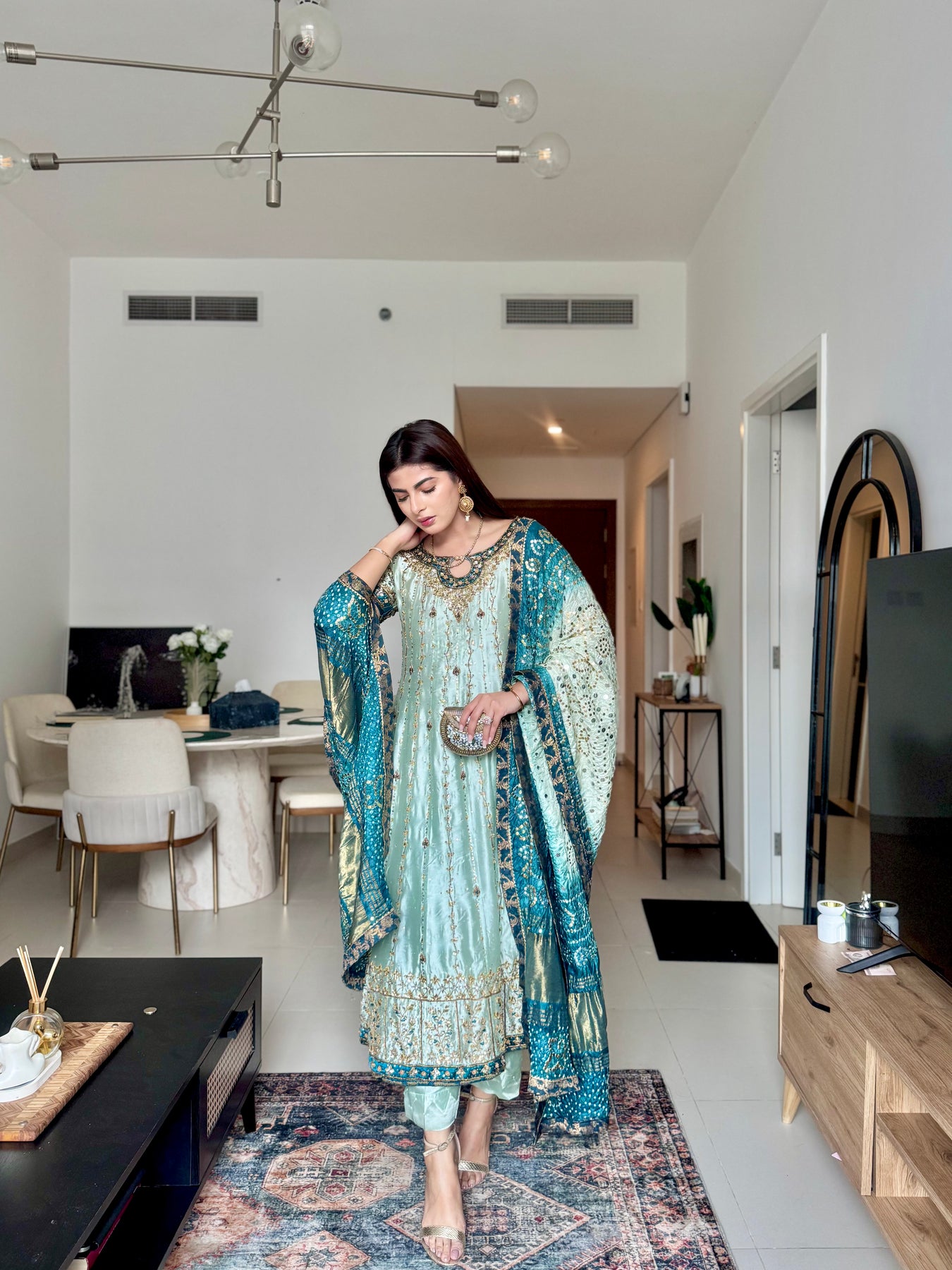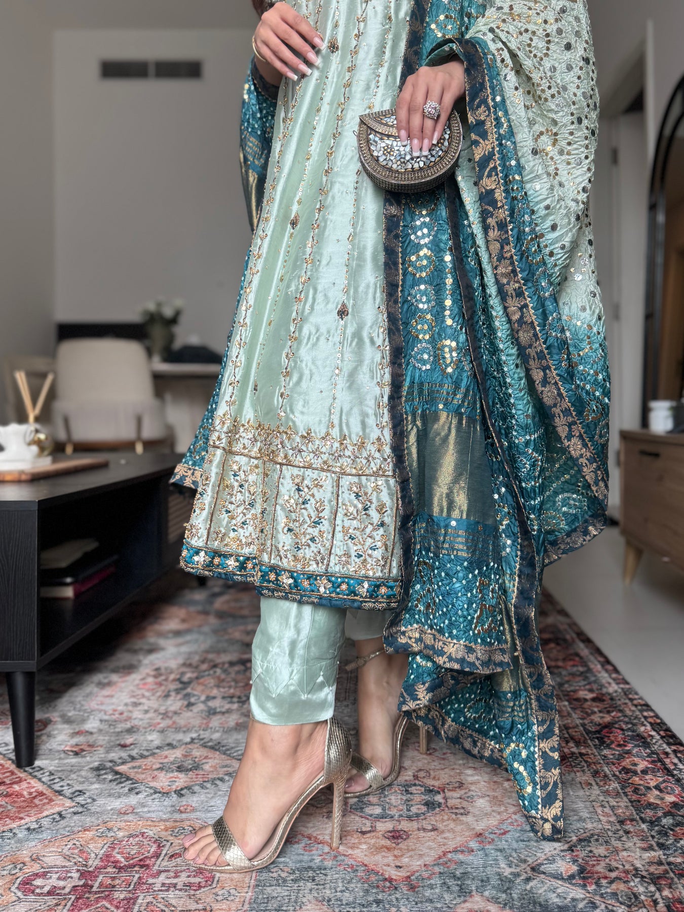 Adorned with intricate hand-embellished traditional gota work, subtly accented with a touch of teal. Styled with a stunning ombre Kamdani chunri chaddar and our signature potli—this ensemble is the perfect blend of timeless charm and effortless versatility. ✨