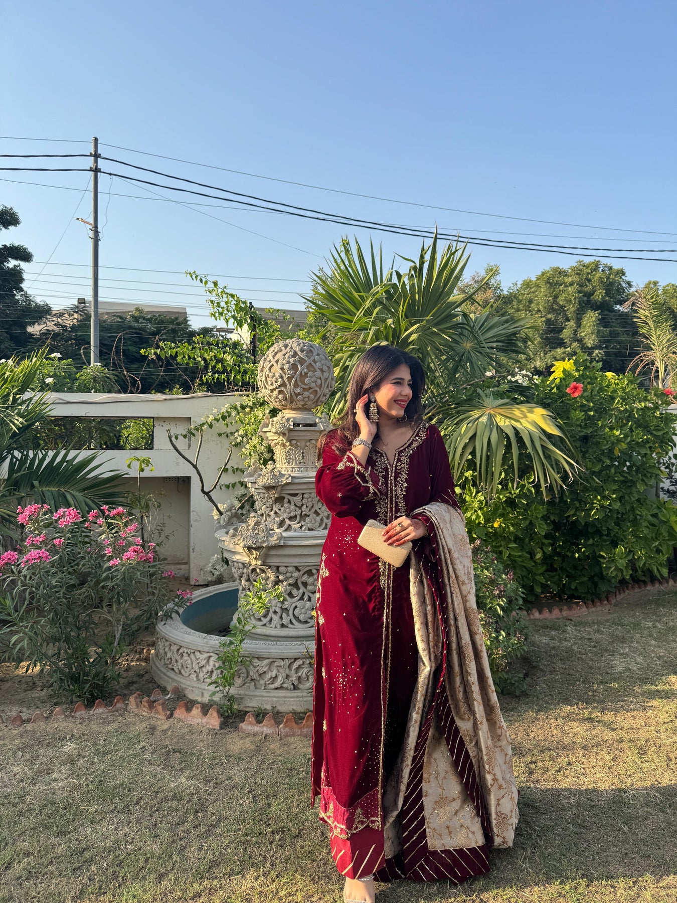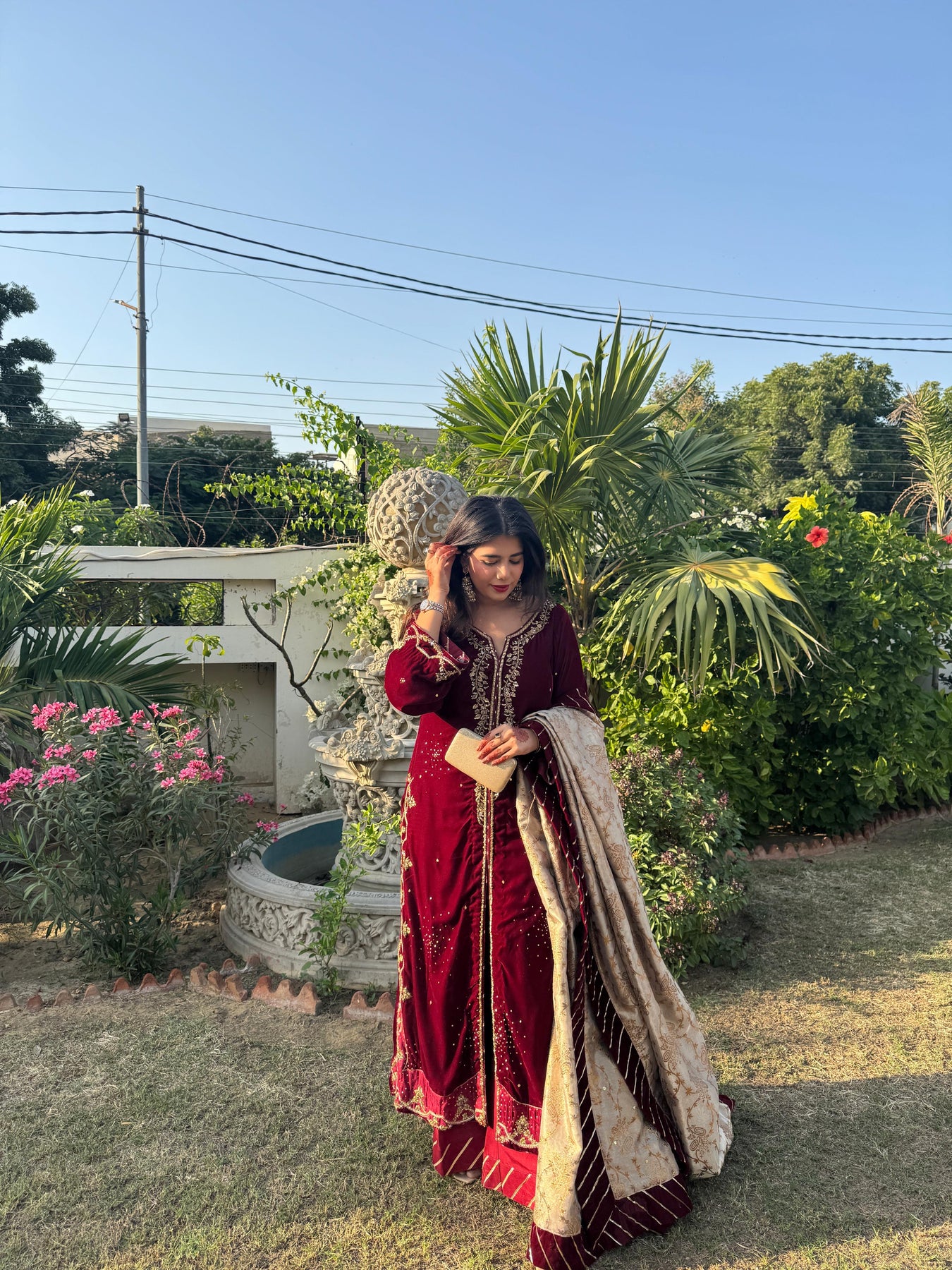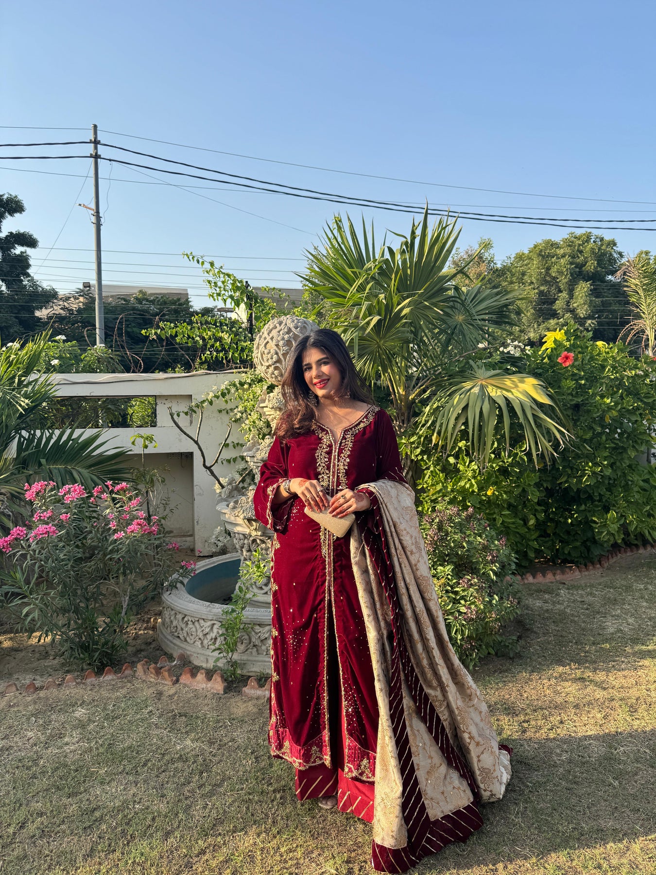 Crafted in rich maroon velvet, this long jacket is meticulously hand-embellished with kora, dabka, sequins, and zardozi. Delicate appliqués add depth and dimension, while playful sequin chan scattered across the silhouette lends a subtle shimmer. Paired with tailored culotte pants and a lustrous lamè shawl, this ensemble creates a look that is effortlessly impactful.