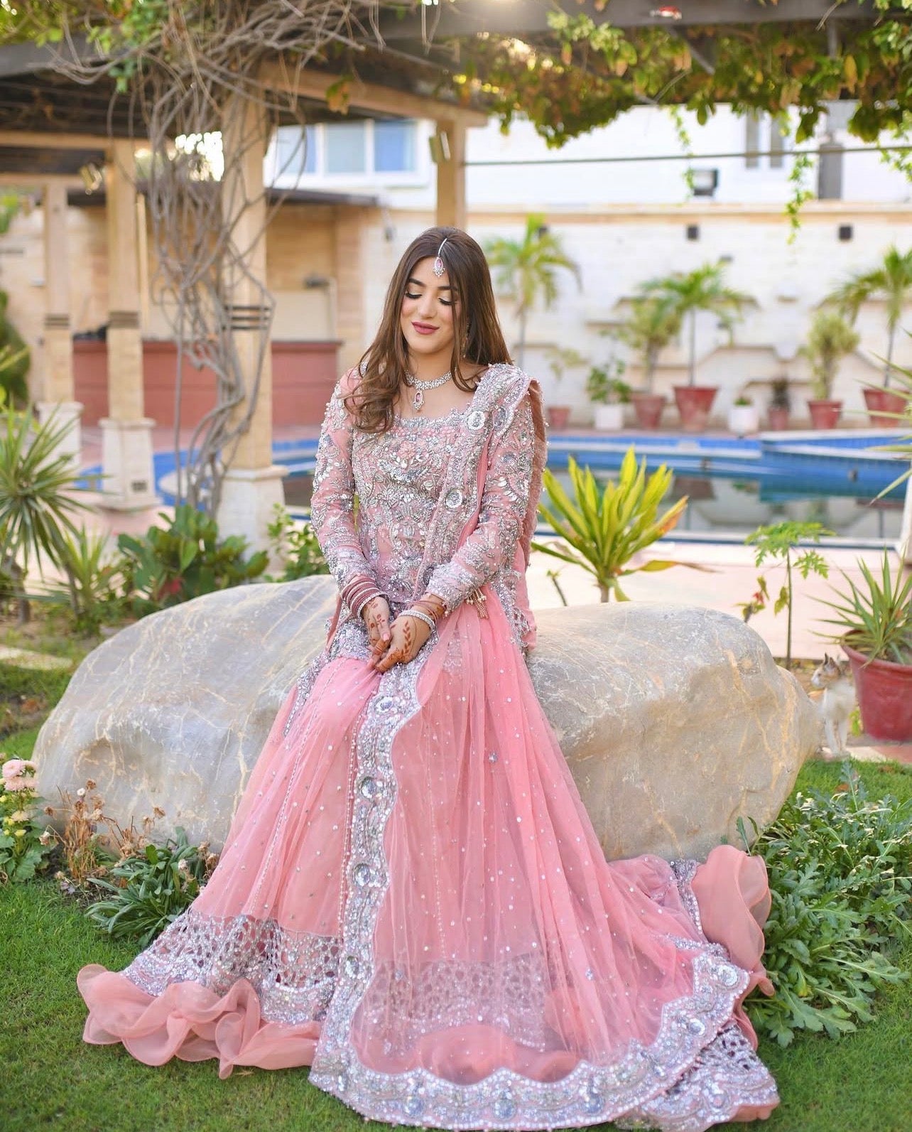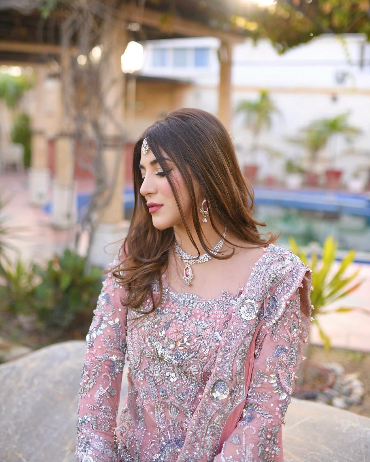 A breathtaking masterpiece for the modern bride, this mermaid-cut bridal set is designed to captivate. The short, fitted shirt beautifully accentuates the silhouette, while the lehenga flares gracefully into a flowing trail, adding drama and grandeur with every step. Adorned with bold, intricate work featuring crystals, pearls, Swarovski, and Zardozi, this ensemble harmoniously blends contemporary materials with artisanal craftsmanship — perfect for brides who desire a striking, flattering, and unforgettable look.