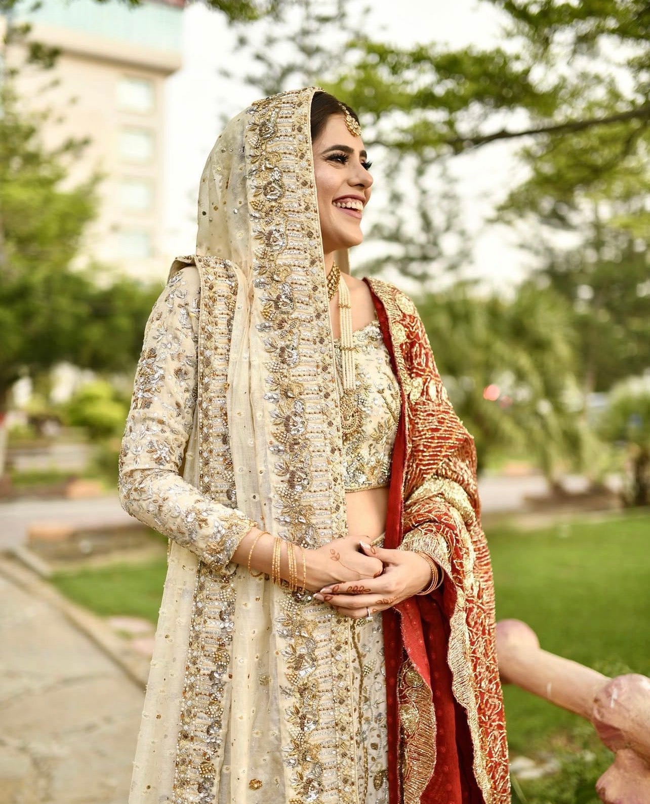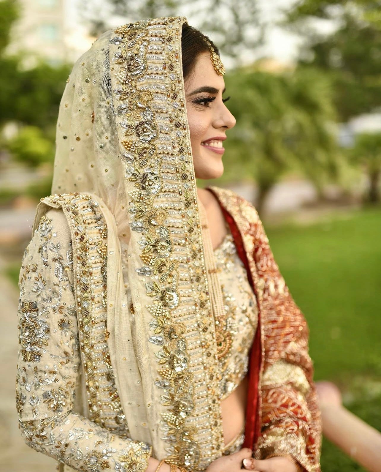Exquisite hand embellishments in kora, dabka, zardozi, pearls, Swarovski crystals, and resham are meticulously placed to create a luminous, ethereal finish. The dupatta is adorned with intricate detailing on all four sides, beautifully framing the entire look.